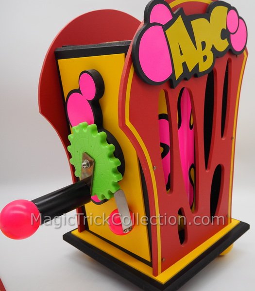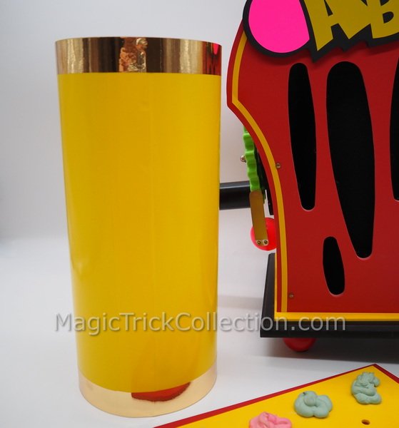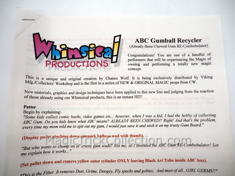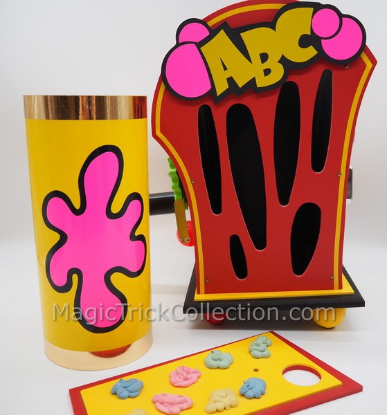 EFFECT: The craziness begins when the performer tells the audience about his ‘unusual’ collection of GUM-WADS! Yes, gum ALREADY BEEN CHEWED! Ewwww! A pallet of assorted gum-wads is displayed. Then the performer introduces the ABC GUM RECYCLER. This wacky machine is taken apart showing both the Combobulation tube and containment chamber empty. The tube is inserted into the chamber and the gum-wads dropped in. One of the Gum wads STRETCHES off the Palette until it SNAPS into your Fingers!