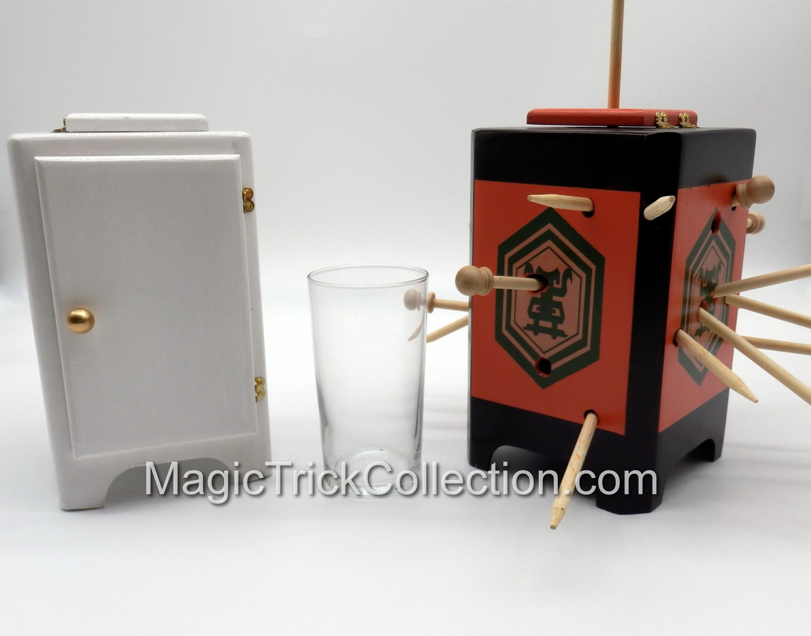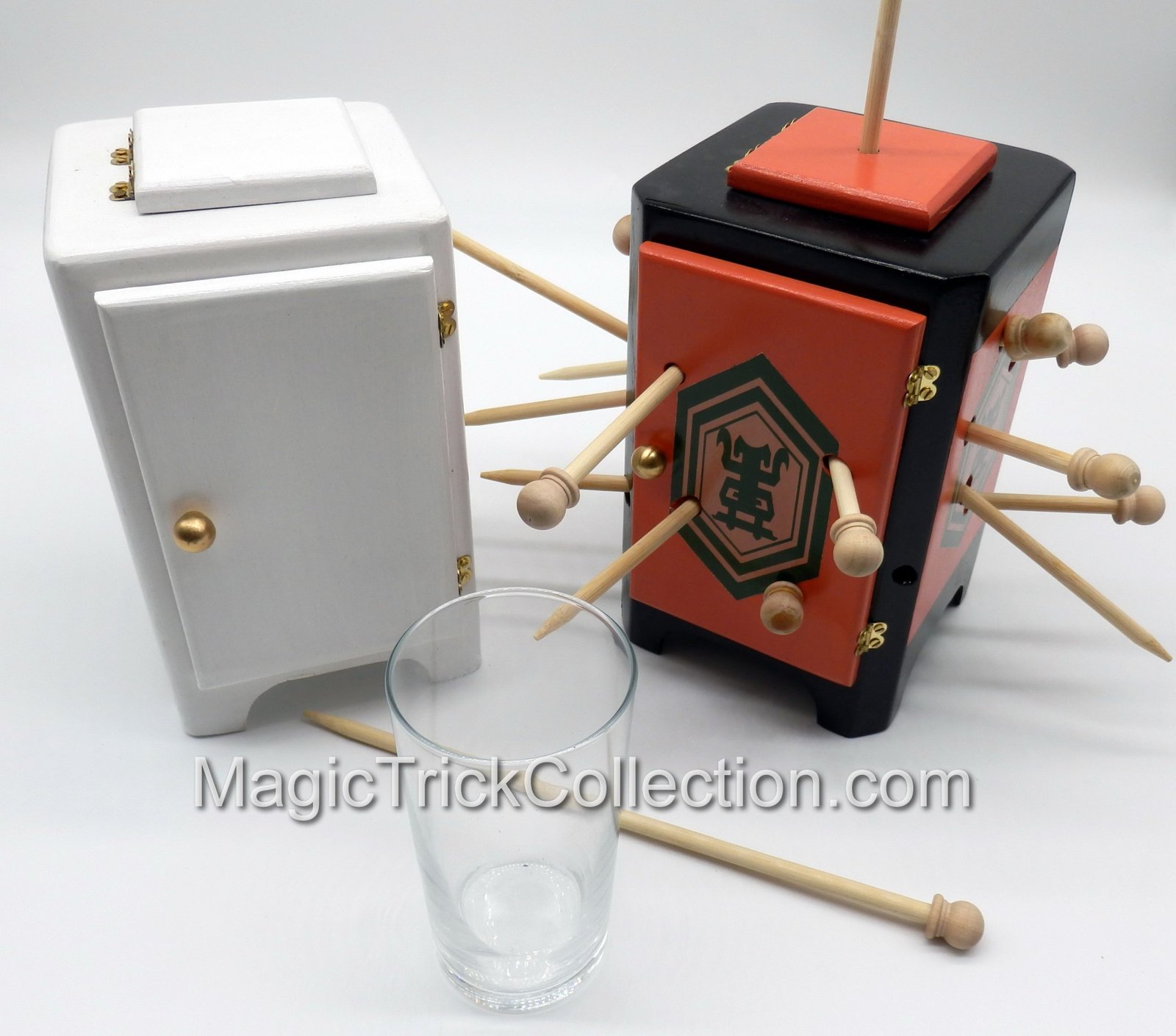 Best of all – the new cabinet is penetrated by one dozen solid wooden spears! Some of the original cabinets used as few as five or six. When you revolve this cabinet filled with spears it truly seems impossible that it could still hold a real glass of milk.
