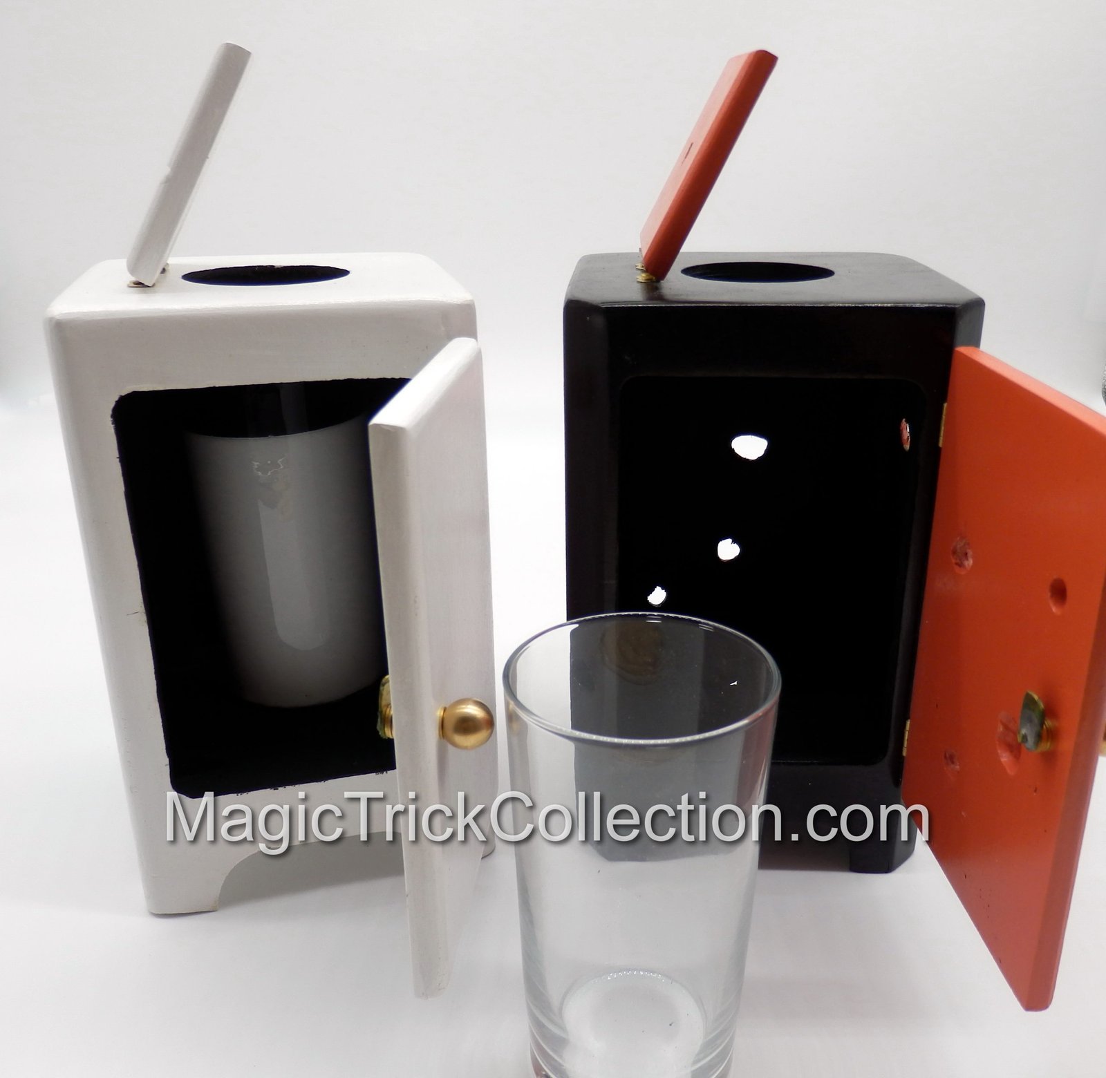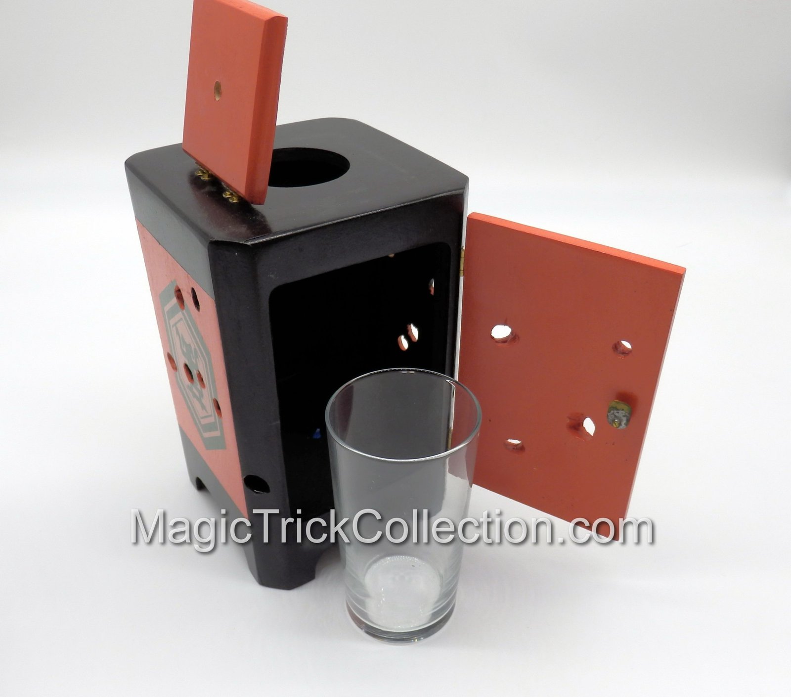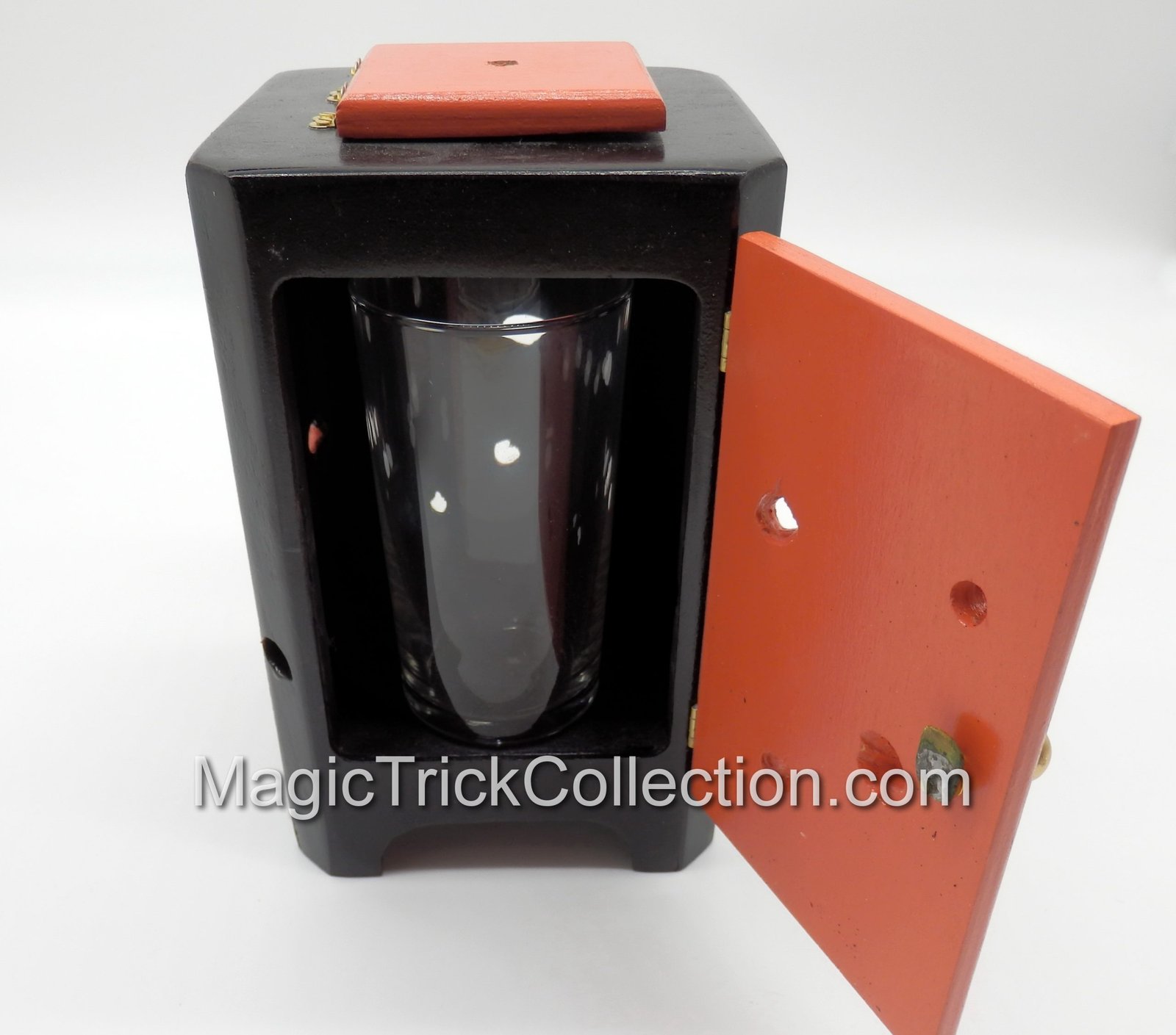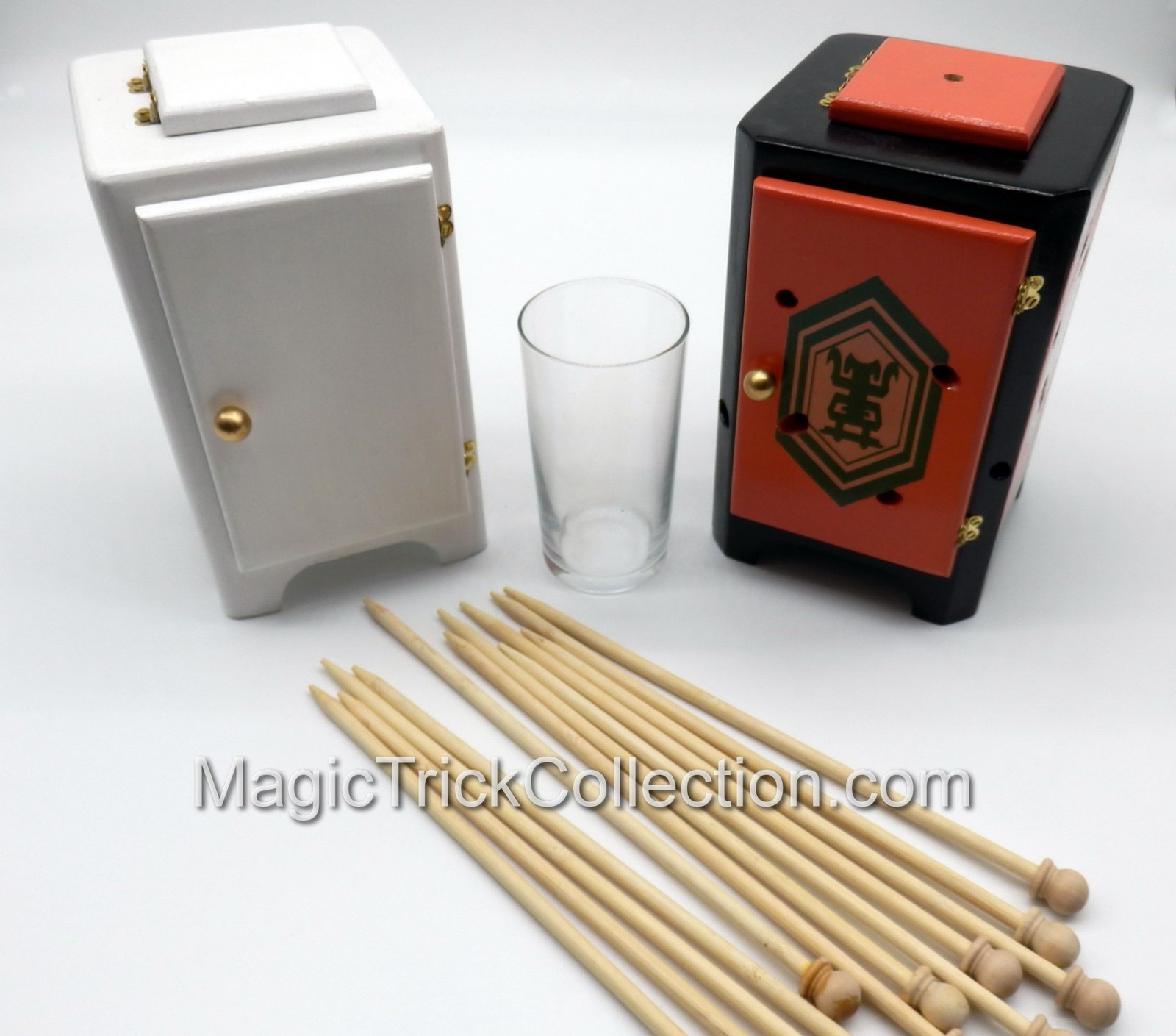 They wanted the Ltd Ed Cabinet to have a top hole which was dead center. In fact, the original routine begins by showing the glass of milk inside the cabinet and the performer attempting to push the top spear through – but it lands squarely in the center of the glass. The door is then closed and the magic happens.
