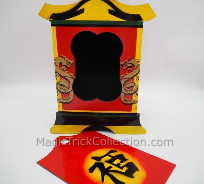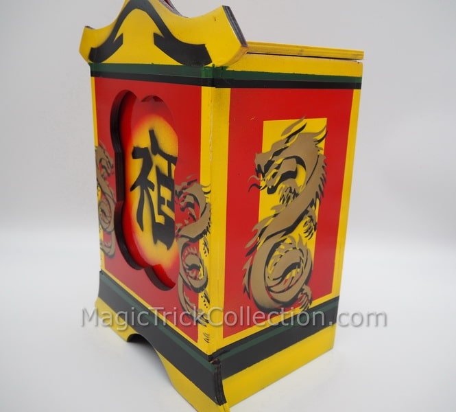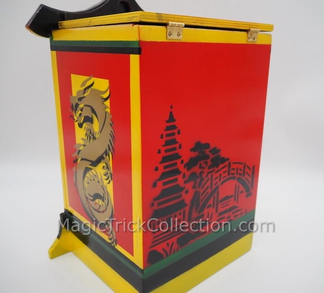 The Ozark Magic Golden Dragon Pagoda an excellent production effect. Standing 16 inches in height and 11 inches wide and 8 inches in depth. Beautiful in design it will allow you to produce doves, a rabbit, or what ever you want to produce. The front panel is removed to show the pagoda empty. Once shown empty the front panel is replaced. A few magical passes the front panel is removed again but this time the pagoda is full of the item you wanted to make appear. The panel is once again replaced another magical pass and the top lid is opened and a large amount of silks, flags, or spring loads are produced.